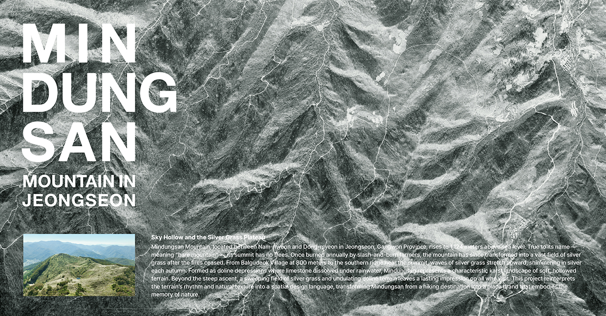 Mindungsan Mountain sits between Nam-myeon and Dong-myeon in Jeongseon County, Gangwon Special Self-Governing Province, rising to an elevation of 1,124 meters. As its name suggests, the summit is almost entirely treeless. The area was once used as slash-and-burn farmland. After cultivation in this area was prohibited, the land naturally transformed into a vast field of silver grass. From the village of Balgudeok at 800 meters above sea level, silver grass continues up the southern ridgeline to the summit, creating waves of shimmering silver in autumn. Mindungsan Mountain exhibits a classic example of a doline—a karst depression formed as limestone strata deposited in shallow seas were dissolved by rainwater. Upon reaching the top after a steep ascent, visitors are greeted with dramatic views where endless expanses of silver grass blend with the undulating doline terrain. This interplay of ecology and geomorphology leaves a lasting impression on all who visit. This project reinterprets the mountain’s terrain and natural textures into a spatial language, establishing Mindungsan Mountain not merely as a hiking destination but as a place brand where visitors can experience the “memory of nature.”